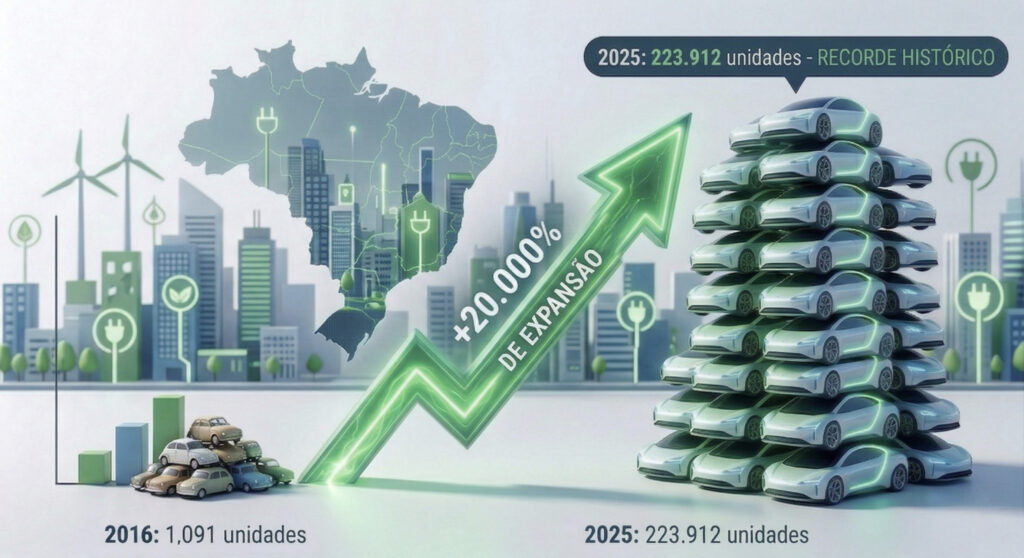 Para entender o tamanho da transformação, basta olhar para o retrovisor. Em 2016, o Brasil vendia apenas 1.091 veículos elétricos por ano. Em 2025, fechamos o ano com o recorde histórico de 223.912 unidades vendidas – uma expansão de mais de 20.000% em uma década.