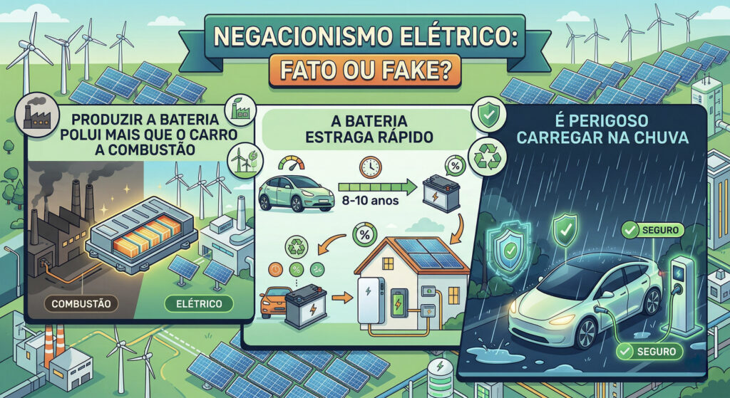 - “Produzir a bateria polui mais que o carro a combustão”: É verdade que a fabricação inicial (do berço ao portão) é intensa em carbono devido à extração de minerais. No entanto, no ciclo de vida completo (do berço ao túmulo), o carro elétrico no Brasil é imbatível. Com uma matriz elétrica 80% limpa, um VE emite até 80% menos CO2 que um carro a gasolina e 40% menos que um a etanol.